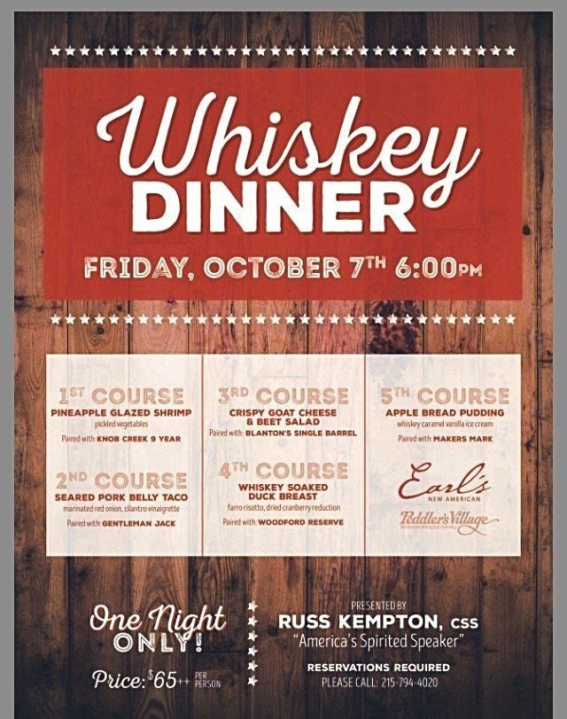- Chesapeake Crab Soup- served with “Old Bay’ Oyster Crackers paired with Bernheim "Small Batch" 7 year Wheat Whiskey.