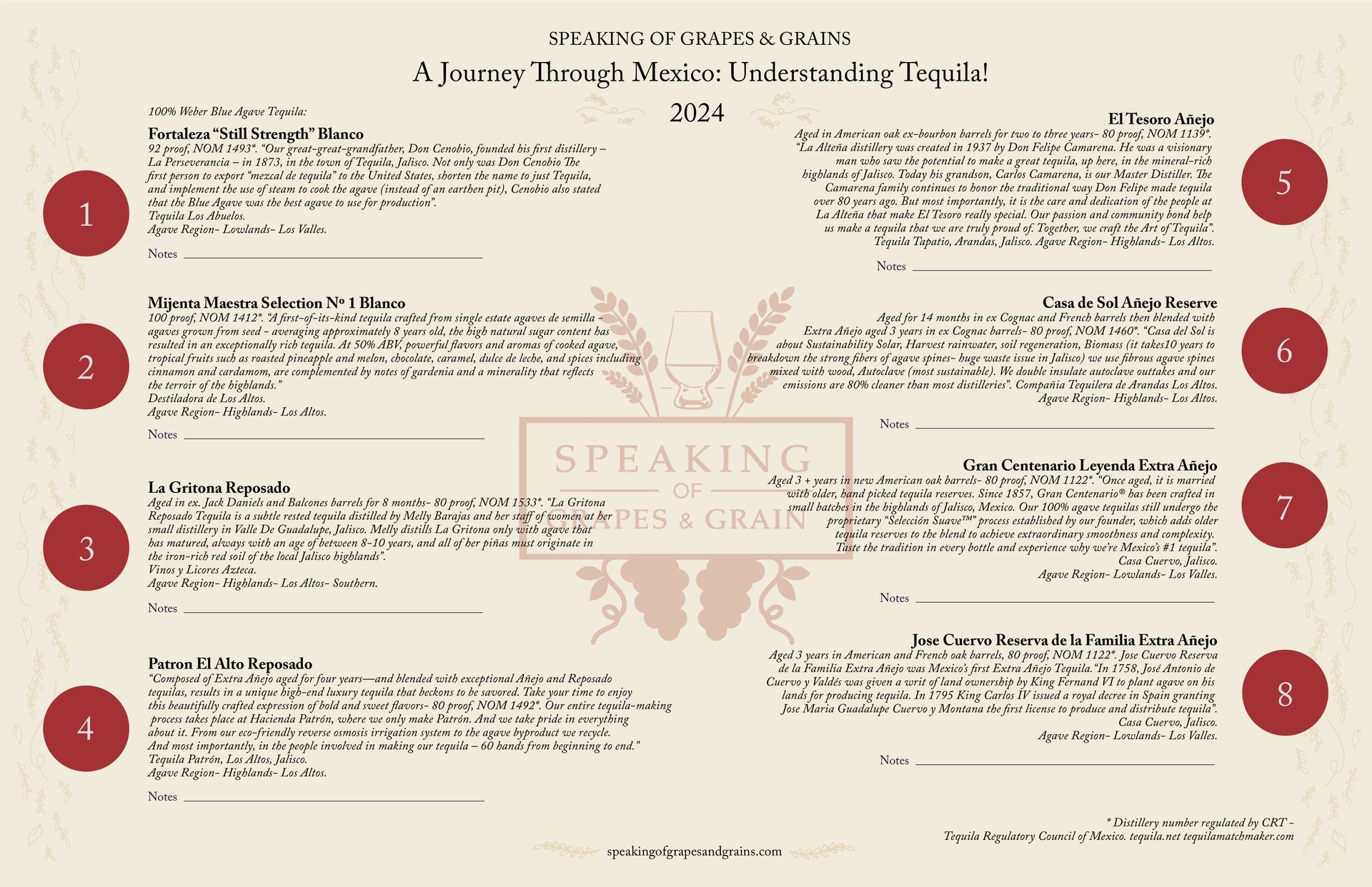 8- Patron Extra Anejo- aged in American, French and Hungarian oak for a minimum of 3 years- 80 proof, NOM 1492*. Tequila Patron, Los Altos, Jalisco. Agave Region- Highlands- Los Altos.